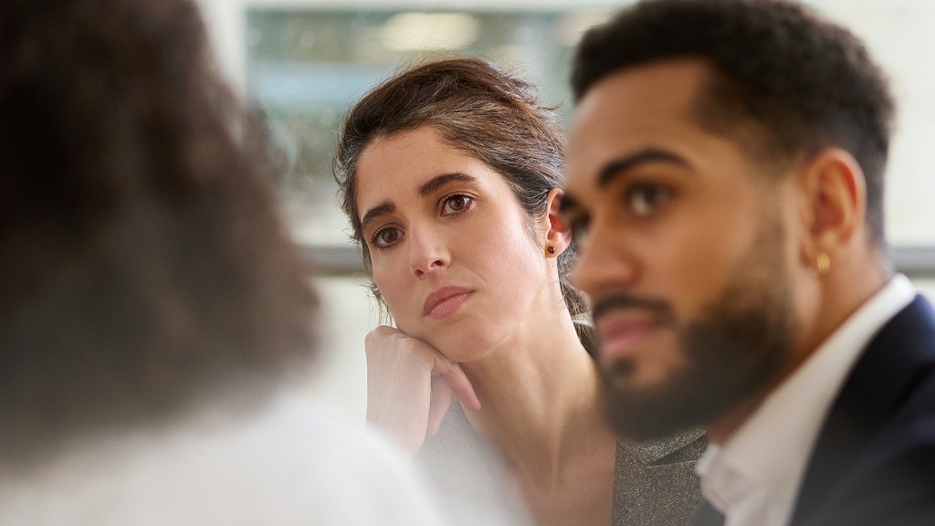 Two young professionals sitting in a meeting.